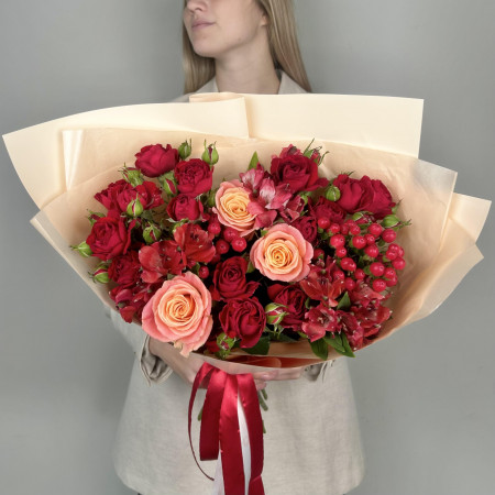 Гербера - 1 шт., Роза кустовая пионовидная - 1 шт., Роза Софи Лорен (50см) РОССИЯ - 3 шт., Эвкалипт большой - 2 шт., Львиный зев - 2 шт., Современная упаковка - 2 шт., Лента атласная - 1 шт.Доставка 0₽ от 30-ти минут