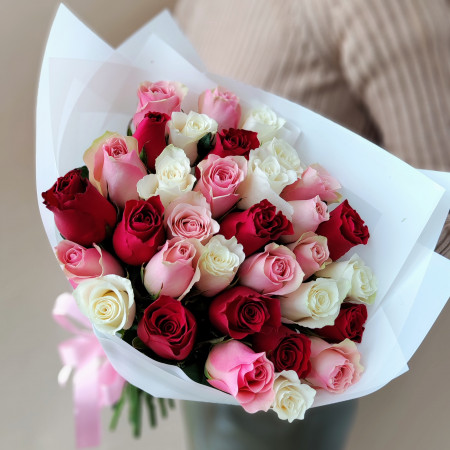 Роза кустовая пионовидная - 5;Роза Луиза (50см) РОССИЯ - 7;Эвкалипт большой - 2;Современная упаковка - 1;Лента атласная - 1;