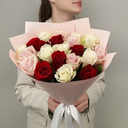 Современная упаковка - 1;Лента атласная - 1;Хризантема кустовая розовая - 3;Роза Джумилия (50см) РОССИЯ - 5;Статица - 2;Русскус отеч. - 5;